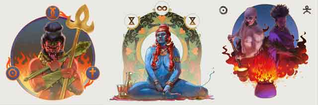 A la derecha de las características está el apartado «Cultos» para anotar la deidad o deidades a las que sigue el personaje. Si haces clic en el botón con el símbolo de más «+», crearás un apartado para rellenar los datos de tu culto, como el nombre de la deidad, tu rango en el culto, tus puntos de runa máximos y actuales, y los subcultos a los que pertenezcas. Si eres iniciado de más de un culto, puedes hacer clic en el botón «+» para añadir otro culto. Cuando ya has creado un apartado de culto, a la derecha del botón «+» aparece otro botón con una llave inglesa y un martillo. Pulsarlo te permite desplazar una sección de culto arriba o abajo usando el botón de las tres rayas, o bien eliminar una sección de culto usando el botón rojo del contenedor de basura.